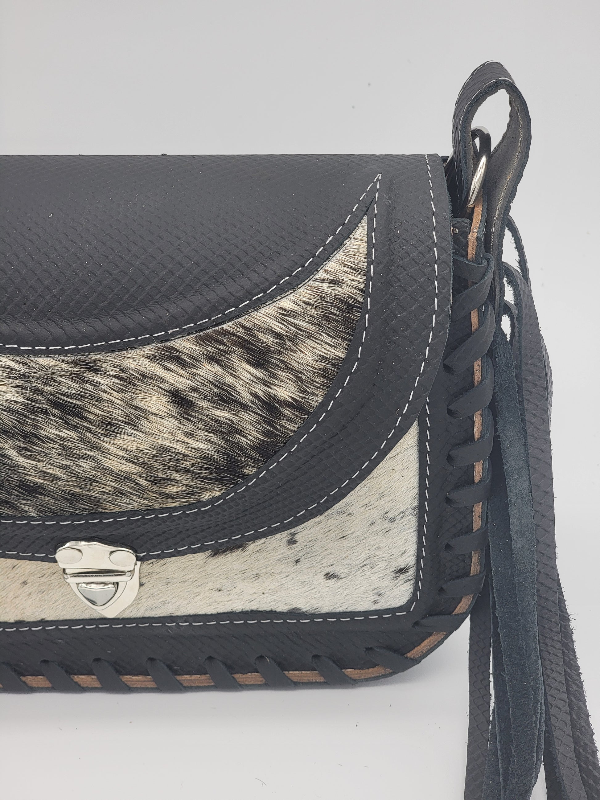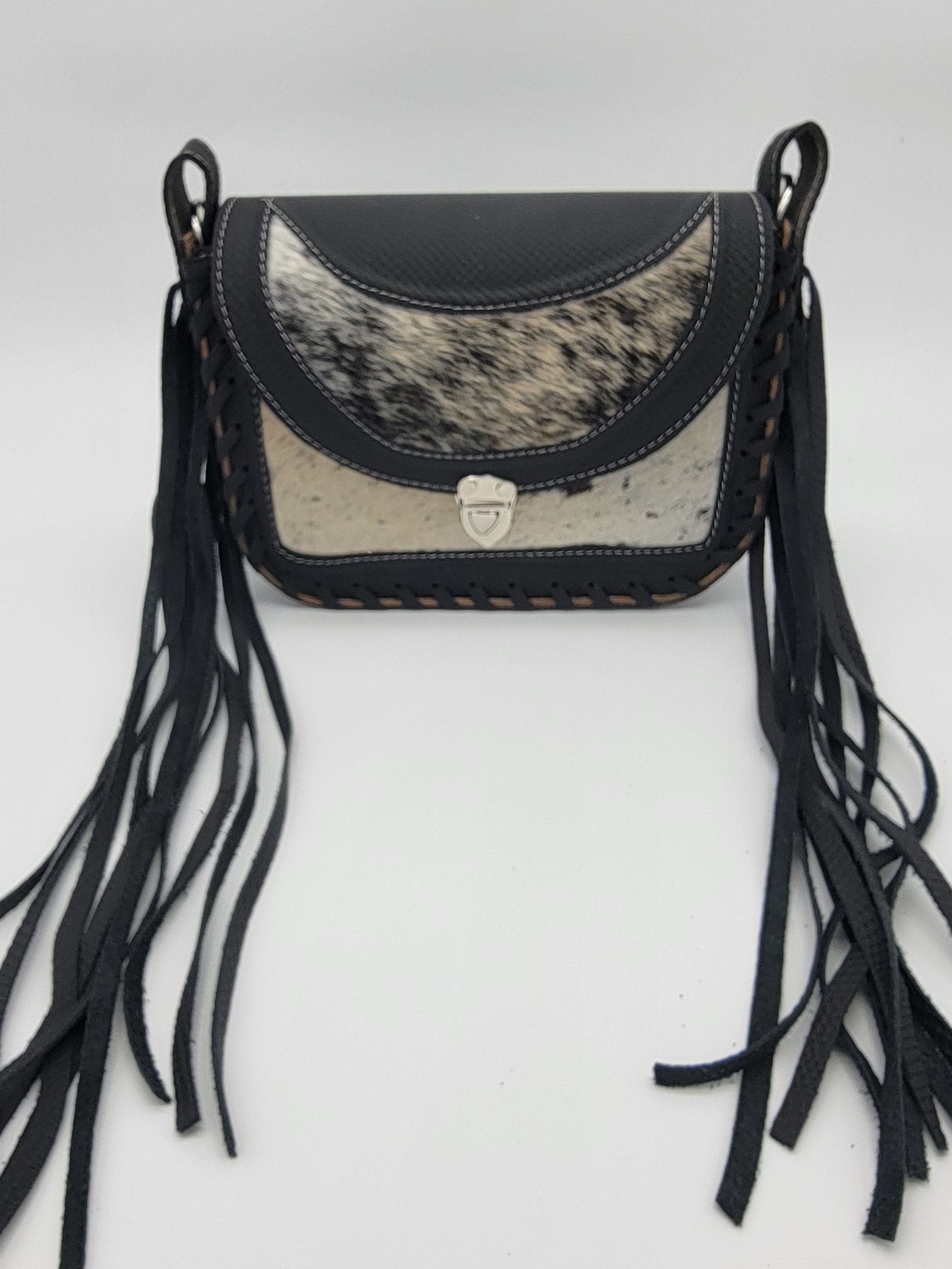 High quality, durable 100% leather and half moon cowhide handmade crossbody purse. Black with white/brown hide. Studded. Fashionable fringe, matching leather strap. No interior pockets. You will be the envy of everyone with this purse.