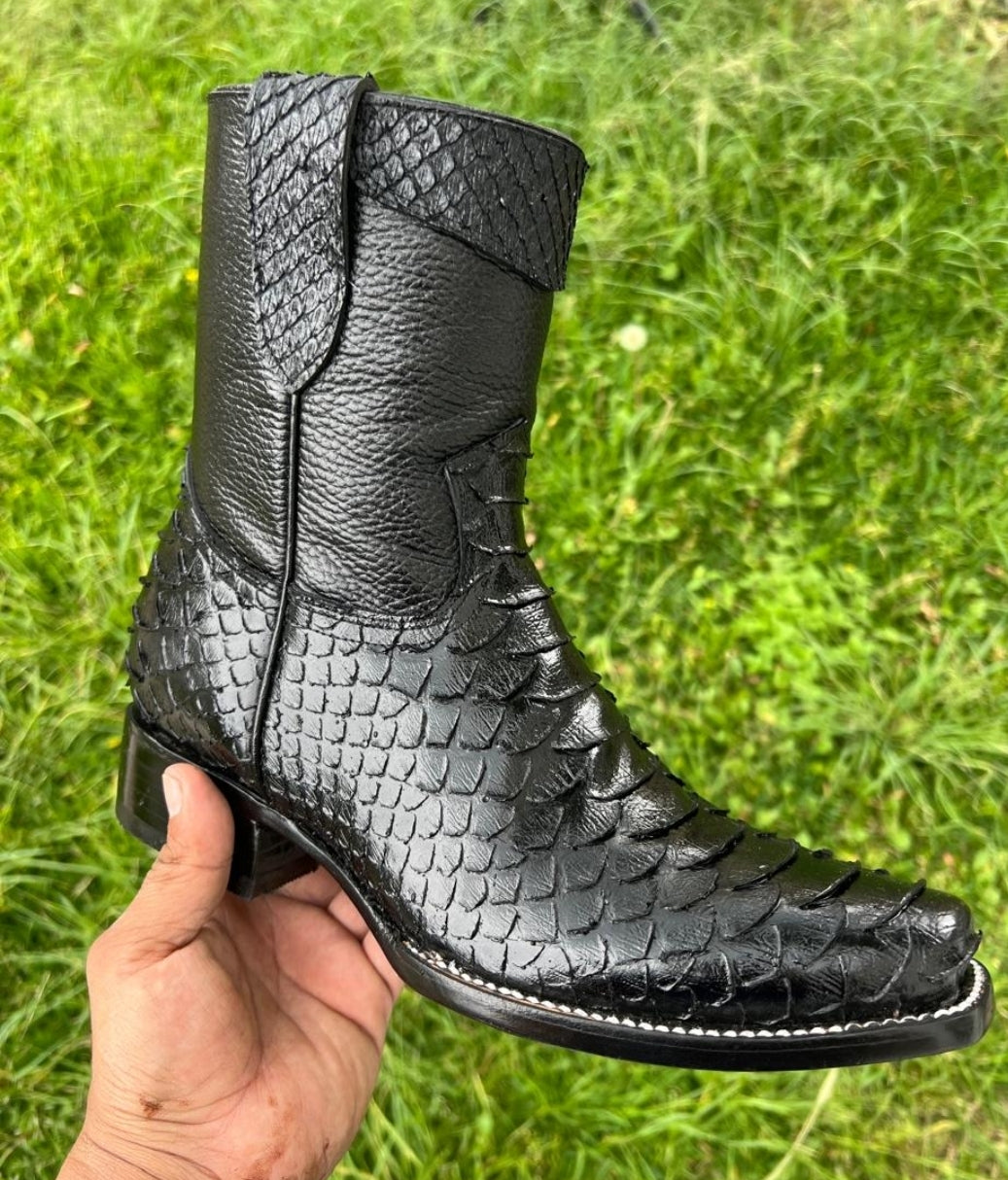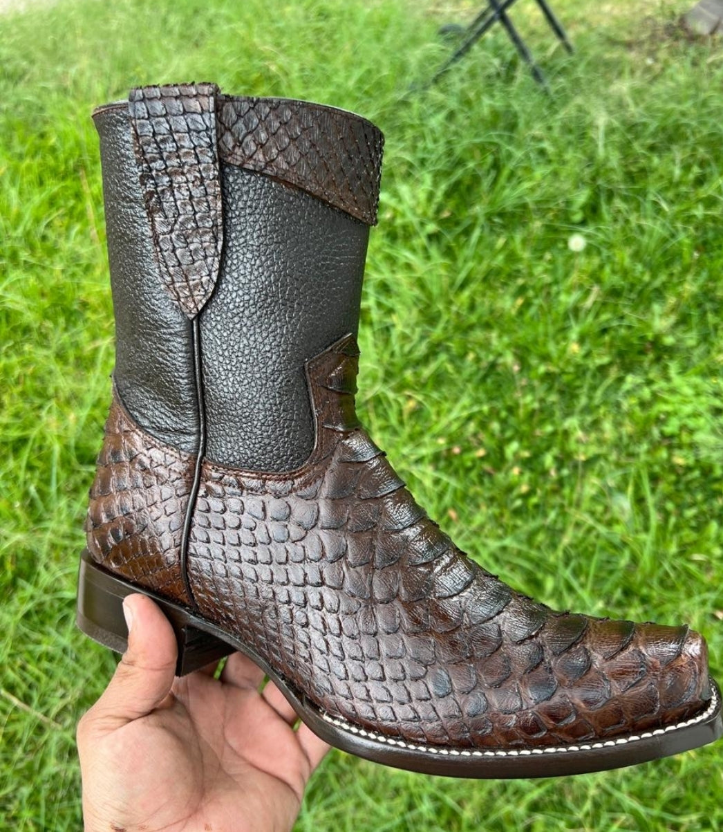 Botas de vestir de cuero para hombre, estilo jinete, clon de pitón, punta cuadrada Lives, cremallera lateral, suela de cuero, forro de cuero, tiradores de cuero y tacón de goma.