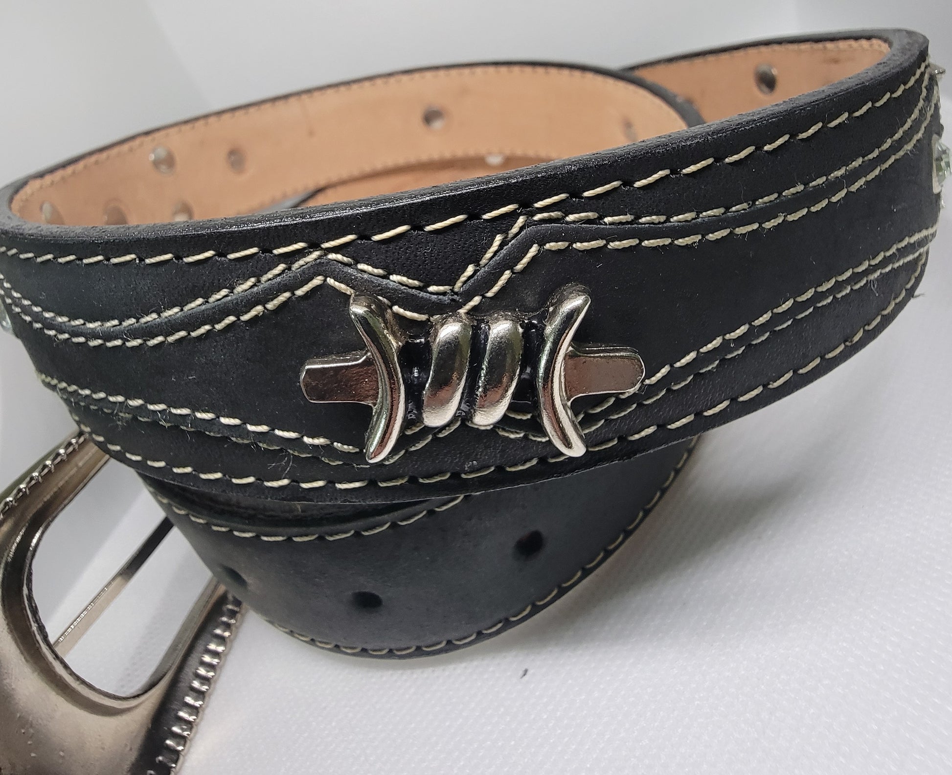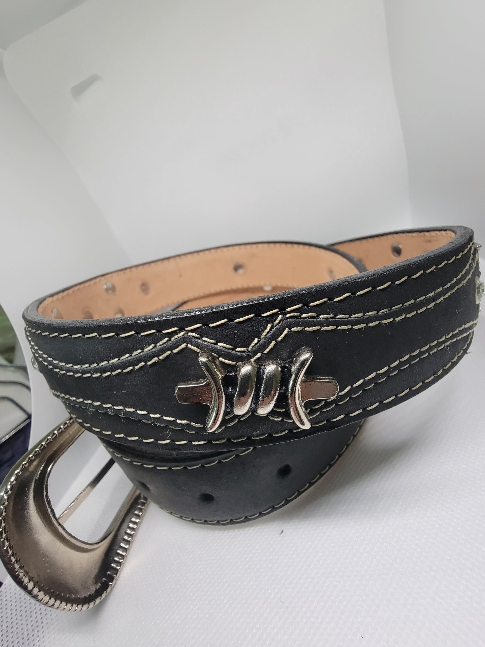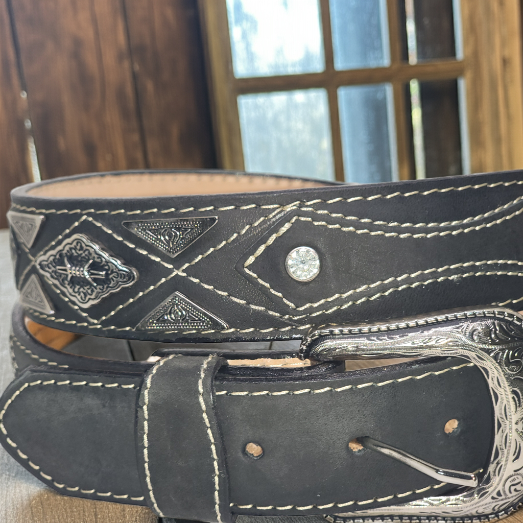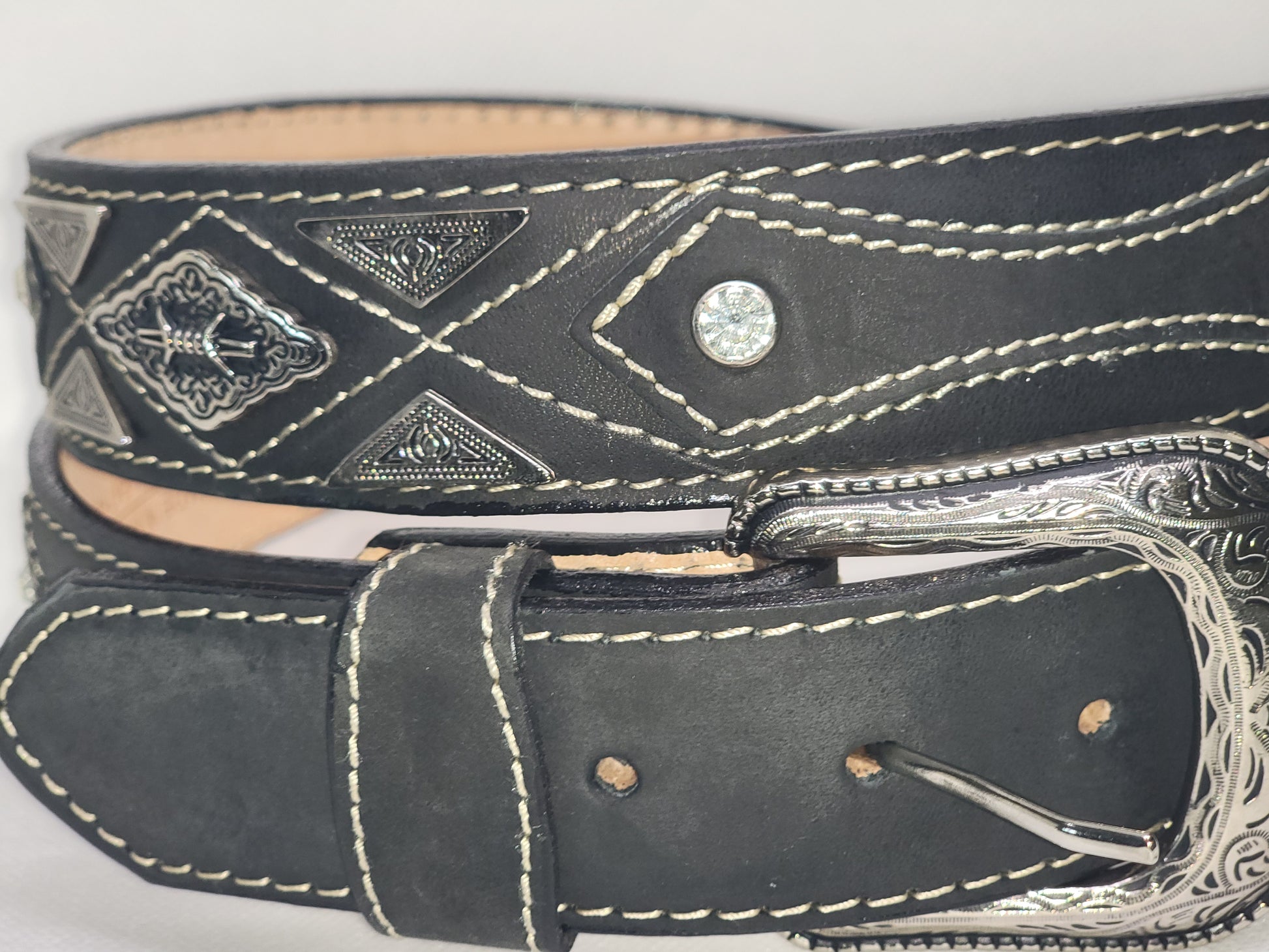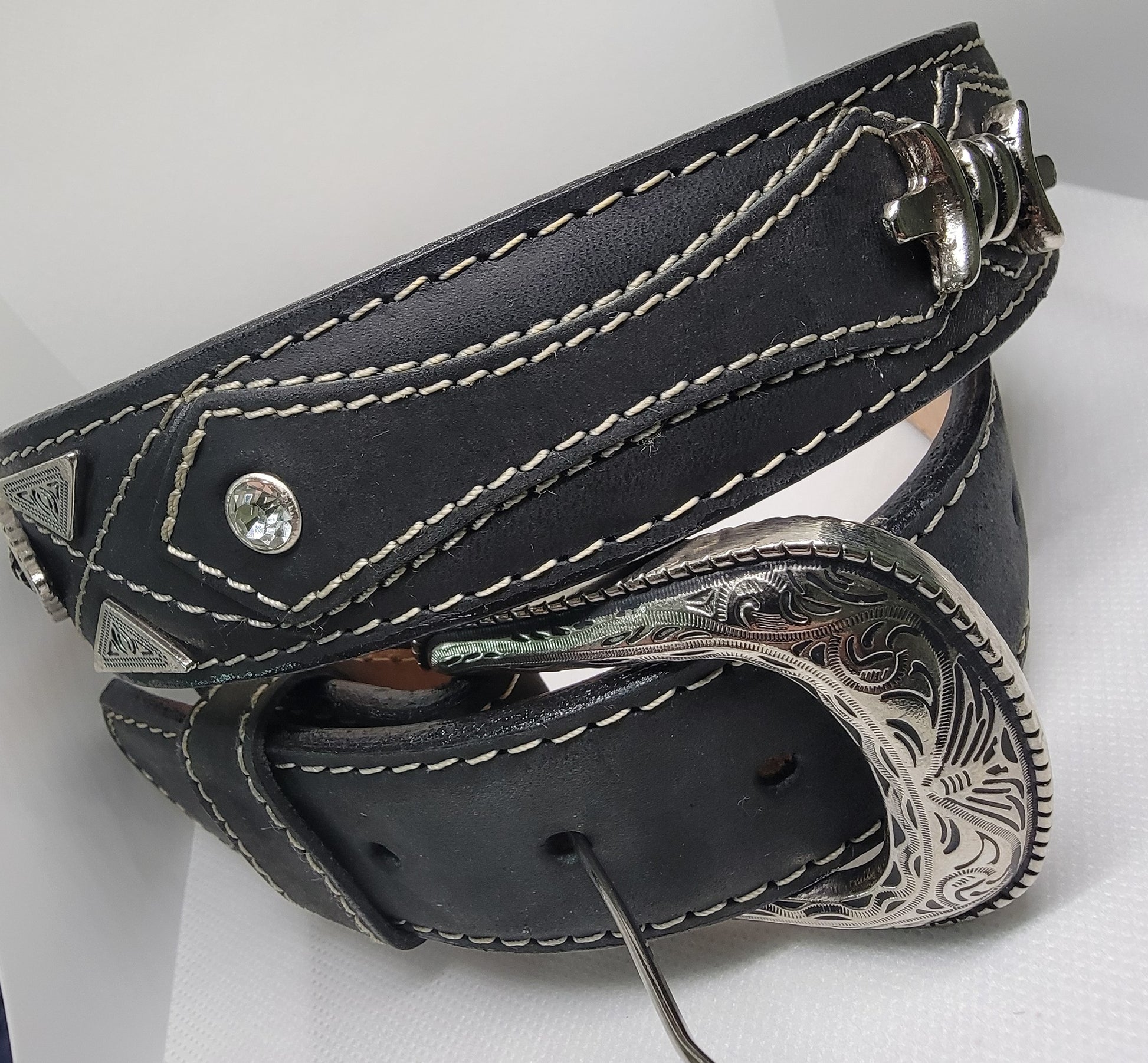 Cinturón de cuero hecho a mano. Diseños de cuerda metálica y piedras transparentes.