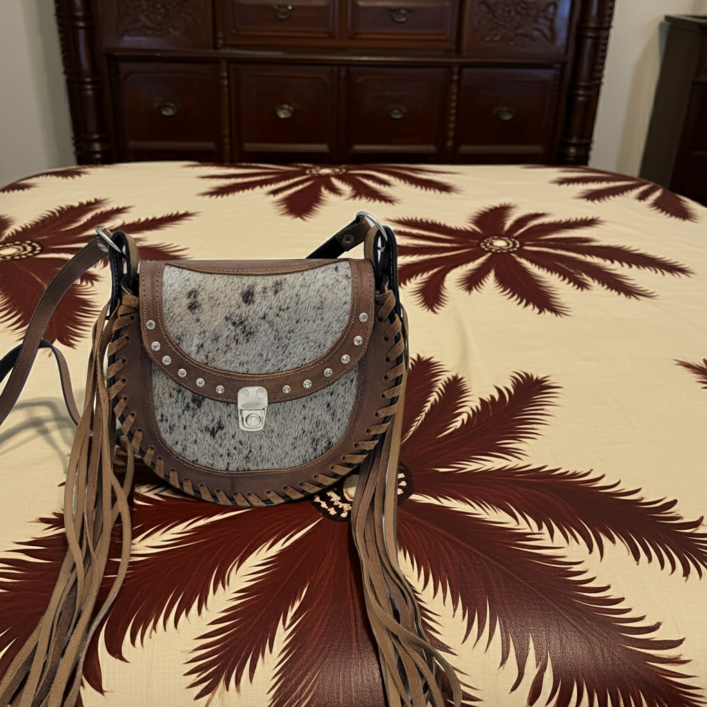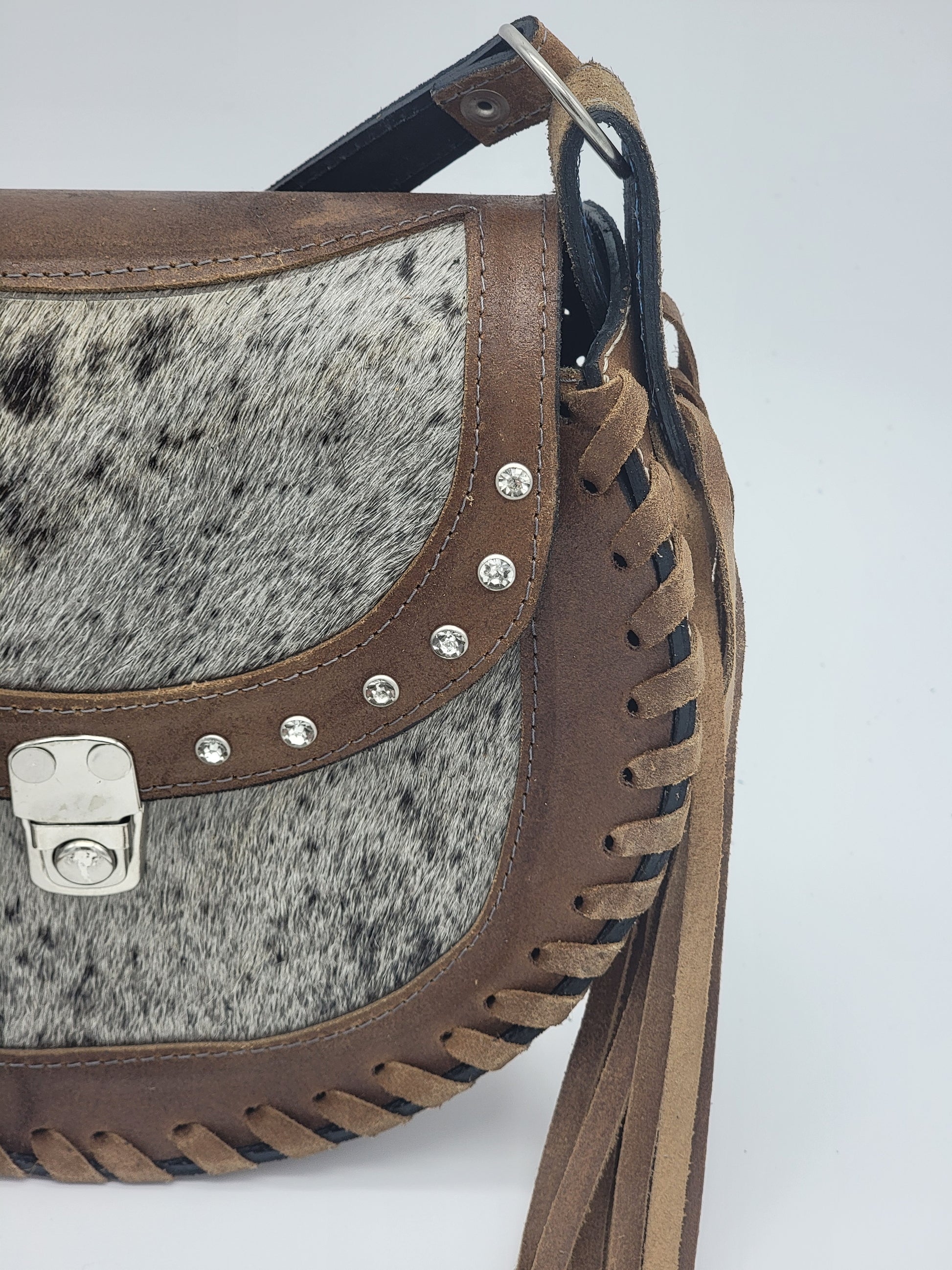 Bolso bandolera de alta calidad y durabilidad, 100 % cuero y piel de vacuno, hecho a mano. Marrón con piel blanca/marrón. Con tachuelas. Flecos de moda y correa de cuero a juego. Sin bolsillos interiores. Con este bolso, serás la envidia de todos.
